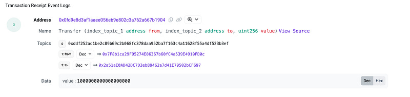 Here we search for Transfer event on block 0x182e86c where 0x7f8b1ca29f95274e06367b60fc4a539e4910fd0c sent LINK token.